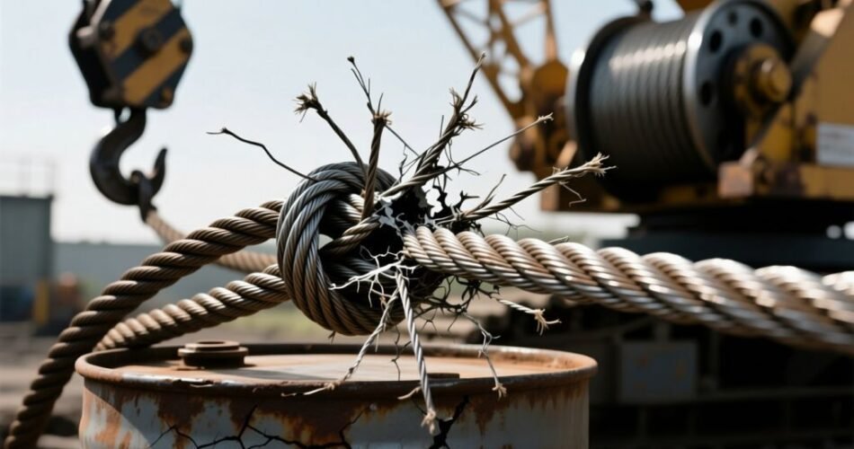 A single broken wire is a warning, but clusters of broken strands in one area are a critical issue. Inspect the entire rope length, focusing on sections that bend over sheaves or pass through the hook block, where stress is highest. Fraying appears as loose, unraveling wires, while bird-caging shows strands bulging into loose loops.